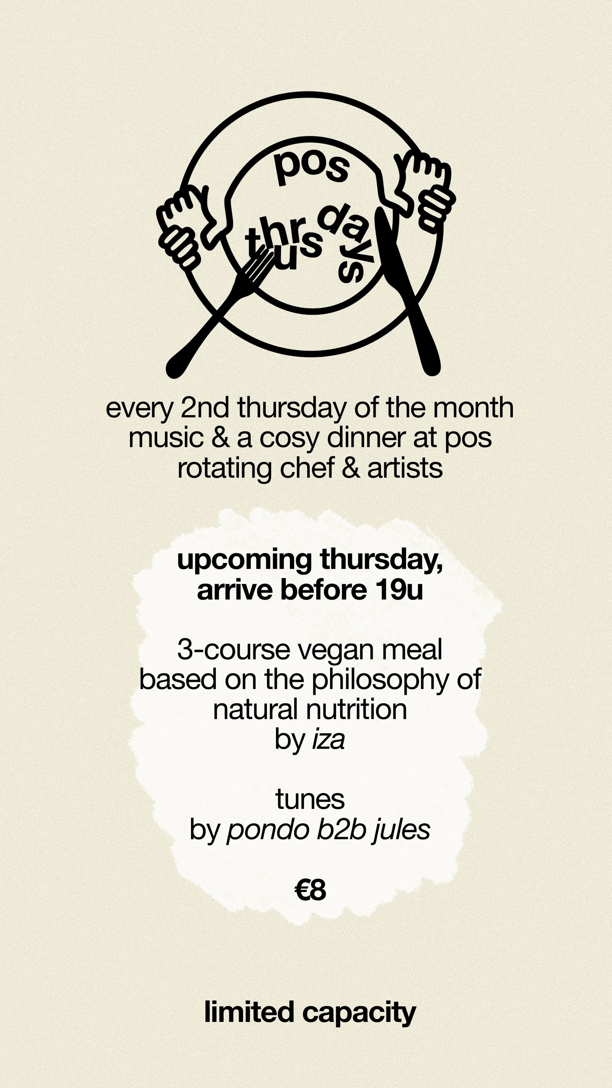 pos thursdays happen on a monthly basis, featuring a cozy atmosphere, a tasty and budget-friendly meal by made by rotating chefs and soothing tunes. the perfect moment to meet each other in a relaxed atmosphere and connect over food. every second thursday of the month!