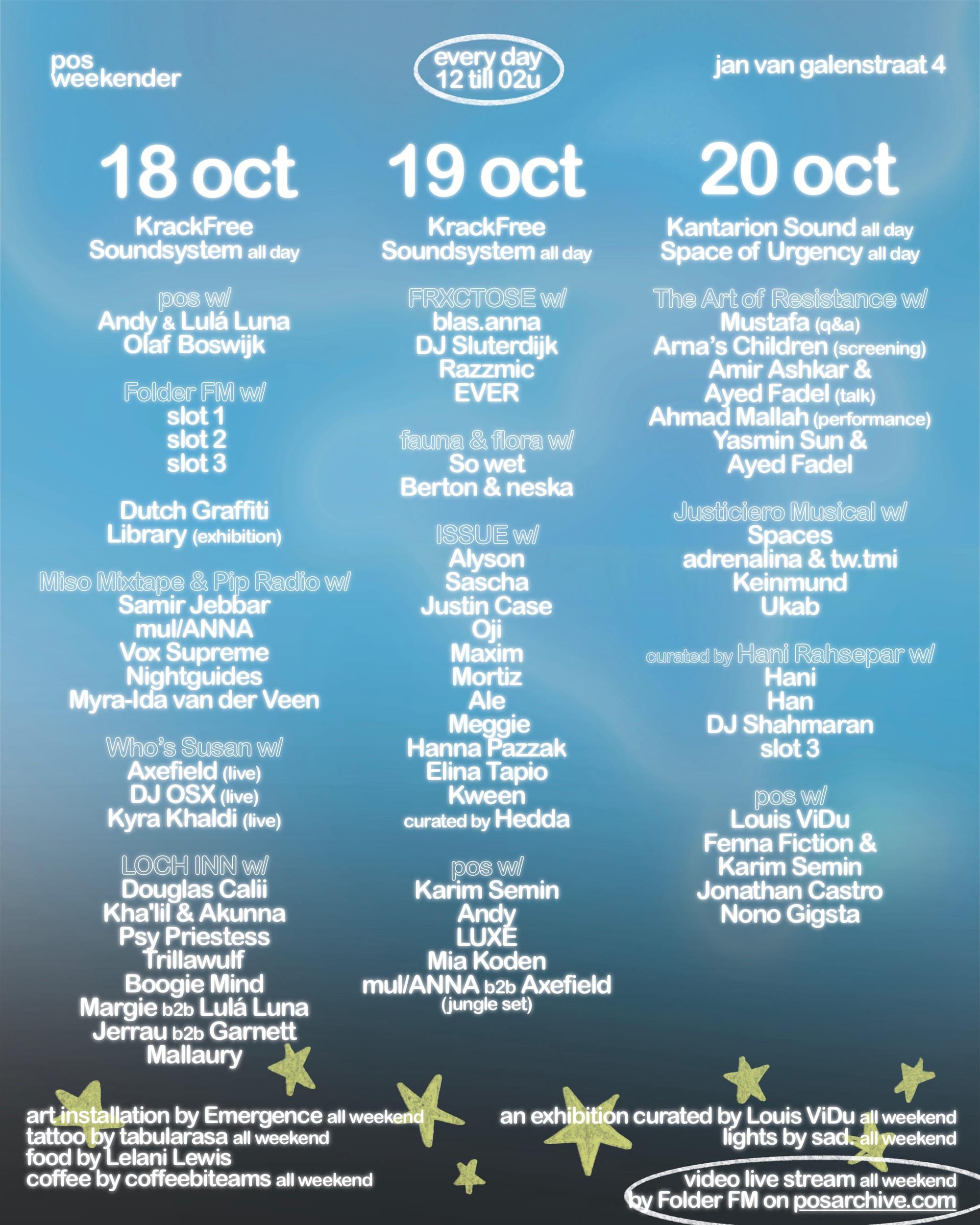 there tends to be this dominant idea that when you organize an event on a large scale, you as the initiator need to take responsibility and lead the way, read: a rigid, fixed organization. however, there’s also a possibility to take a step back at this very moment, in order to create space for others to do the same, and start creating together. collaborating and working together allow us to, first of all, create art from a space where needs are met, and second, learn from each other through the process of creation. this is where the word "open" comes in, there’s space for people's initiatives and ideas to come to the forefront.